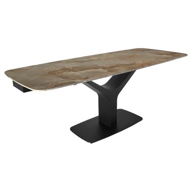 Совершенное сочетание формы и функциональности. Керамическая столешница, на которую нанесено изображение среза агатового камня с глянцевым покрытием, не только выглядит изысканно, но и чрезвычайно устойчива к повреждениям. Уникальное основание из черного металла – смелый акцент, привлекающий своей архитектурной формой и обеспечивающий прочность и стойкость. А когда понадобится дополнительное пространство, просто