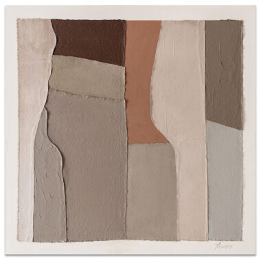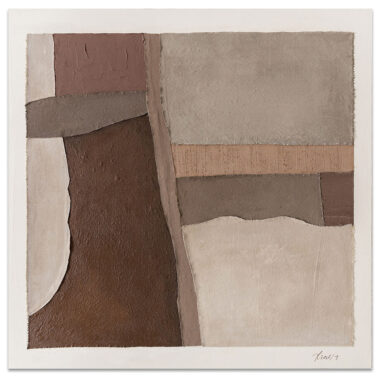Эта картина создана из окрашенных фрагментов ткани и бумаги, образующих многослойную, фактурную поверхность. Спокойная палитра натуральных оттенков – от теплого бежа до глубокого коричневого – формирует атмосферу гармонии и уюта. Лаконичная форма и естественные оттенки выглядят очень органично, что делает картину идеальным дополнением к современному интерьеру. Тонкая рама цвета натурального