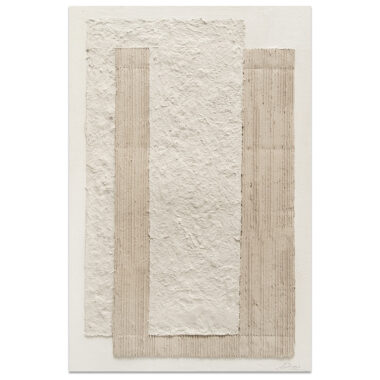 Эта уникальная абстрактная картина ручной работы станет изысканным дополнением современного интерьера. Работа выполнена на холсте и отличается интересным сочетанием материалов. В изображении использованы рельефные накладки из бумаги и густая фактурная краска светлых, нейтральных оттенков, что создает увлекательную игру текстур и глубины. Вертикальные элементы из гофрированной бумаги придают композиции строгость и