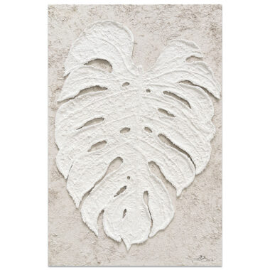 Эта эффектная картина ручной работы добавит в ваше пространство ощущение естественной элегантности. Работа создана на холсте в минималистичной палитре кремовых и светло-бежевых оттенков. Центральным элементом является большой лист монстеры, который вырезали из бумаги и покрыли фактурной краской. Этот прием создает поразительный рельеф и глубину изображения. Картина окружена тонкой рамой с