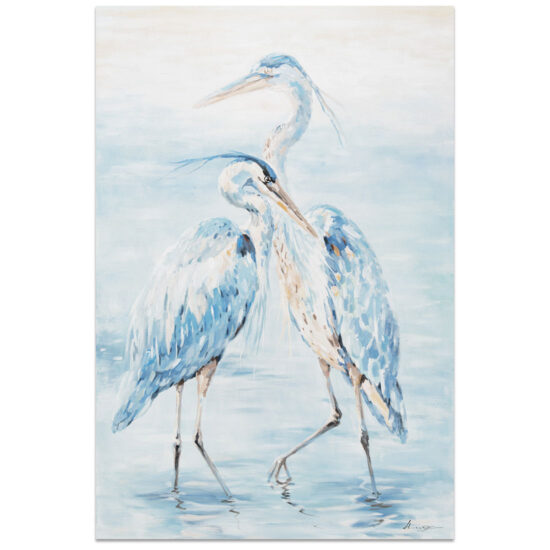 Эта картина, написанная вручную на холсте, передает спокойствие и гармонию природы через образ грациозных цапель. Легкие мазки и мягкие оттенки голубого создают ощущение воздушности и тишины, будто птицы вот-вот растворятся в утренней дымке. Картина обрамлена тонкой рамой с цветным покрытием светлого дерева, что придает композиции естественность и завершенность. Идеальный выбор для интерьеров, где ценят покой, свет и элегантность ручной работы.