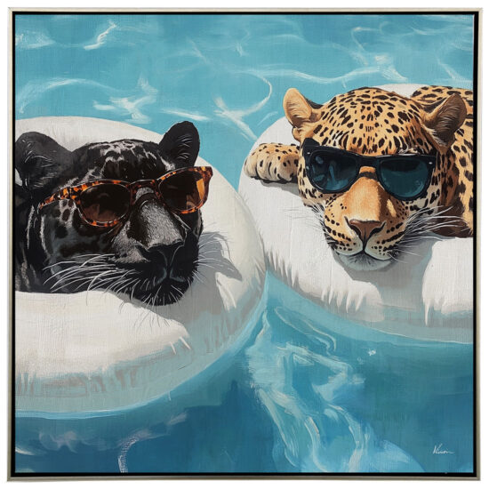 Эта стильная и шутливая картина изображает пантеру и леопарда, которые беззаботно отдыхают в бассейне, наслаждаясь солнцем в солнцезащитных очках. Основное изображение выполнено цифровой печатью, после чего художник вручную нанес краски, добавляя полотну глубину и фактурность. Благодаря этому сочетанию современных технологий и ручной работы картина выглядит живой и динамичной. Тонкая серебристая рама гармонично подчеркивает яркие оттенки воды и создает завершенный вид.