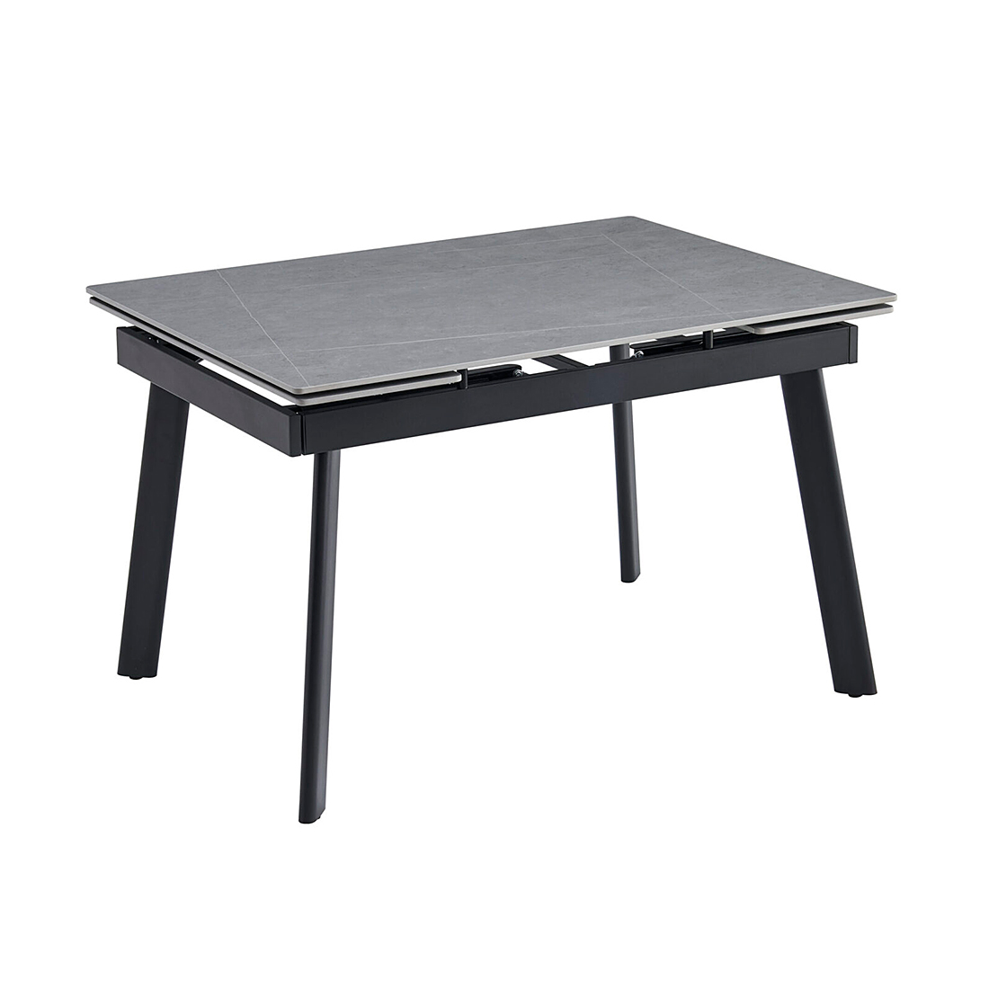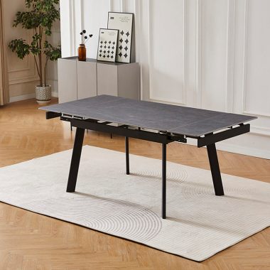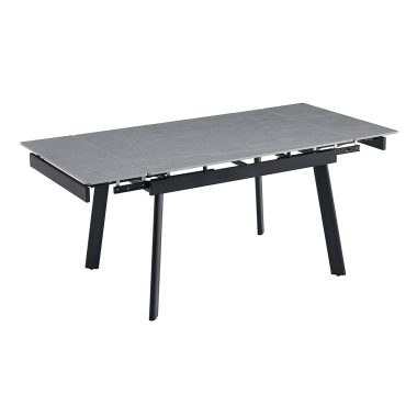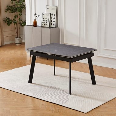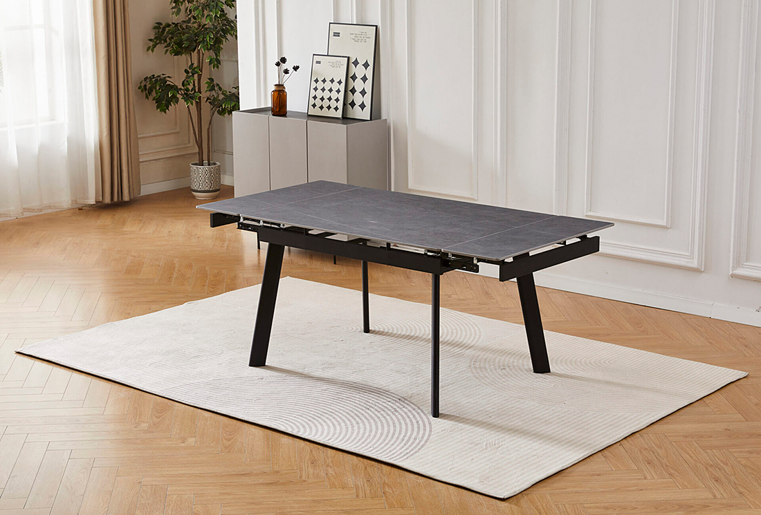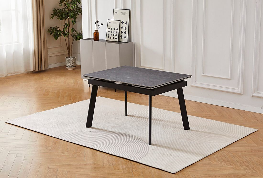 Этот стол – не только стильный элемент интерьера, но и надежный помощник, который сохранит свой безупречный вид на долгие годы. Керамическая столешница не боится царапин, устойчива к высоким температурам и не впитывает жидкости, что делает ее очень легкой в уходе. Даже разлитое вино, кофе или жирные пятна не оставят следов. На поверхность столешницы нанесено изображение серого мрамора с легкими светлыми прожилками, что придает столу элегантность, сохраняя при этом все преимущества современного материала. Прочные черные металлические ножки обеспечивают надежную опору, а благодаря выдвижным боковым частям вы быстро увеличите столешницу, создавая комфортное пространство для больших компаний.