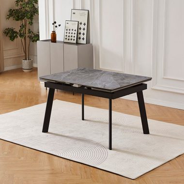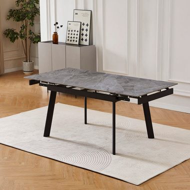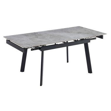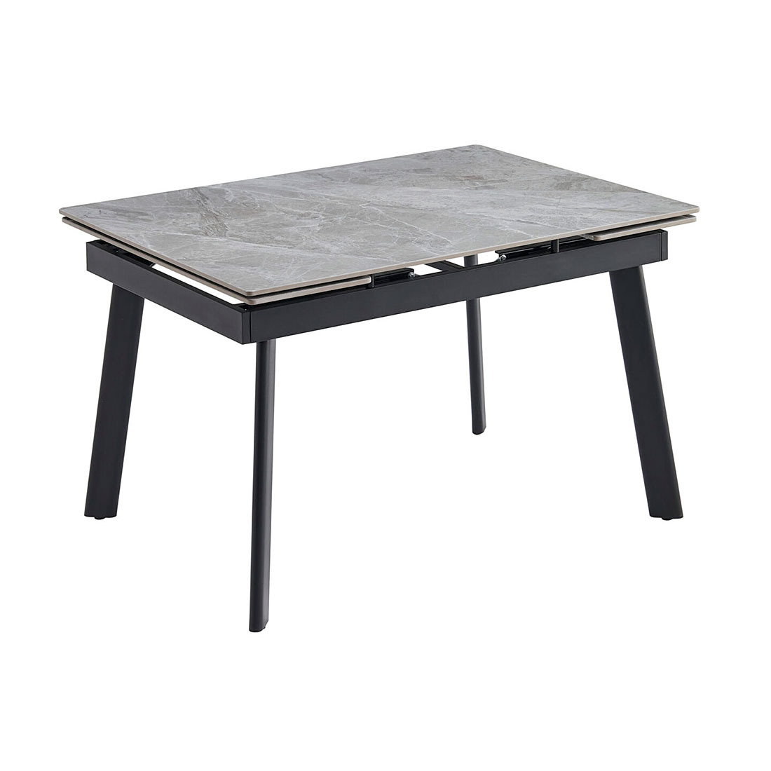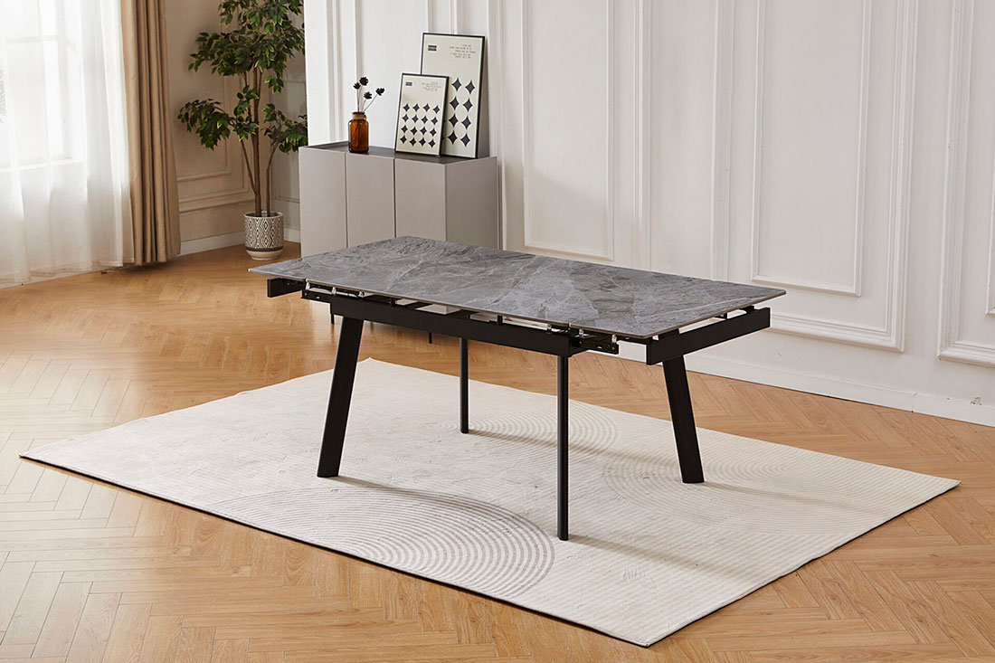 Этот стол – идеальное решение для тех, кто ценит функциональность и хочет создать теплую и элегантную атмосферу в своем доме. Керамическая столешница с глянцевым изображением тепло-серого мрамора создает ощущение уюта и изысканности. Глянцевое покрытие не только подчеркивает красоту узора, но значительно облегчает уход. Прочные черные металлические ножки обеспечивают надежную опору, а с помощью 40-сантиметровых выдвижных боковых частей вы легко увеличите столешницу от базовых 160 см до 200 см и 240 см соответственно.