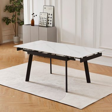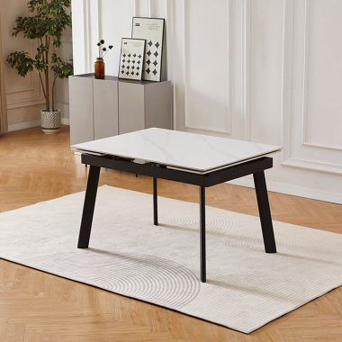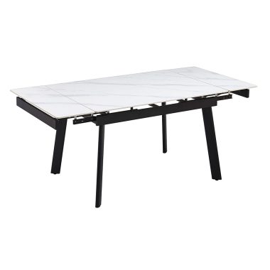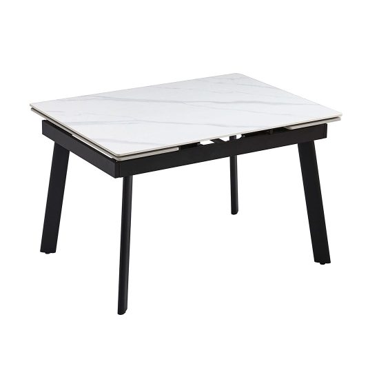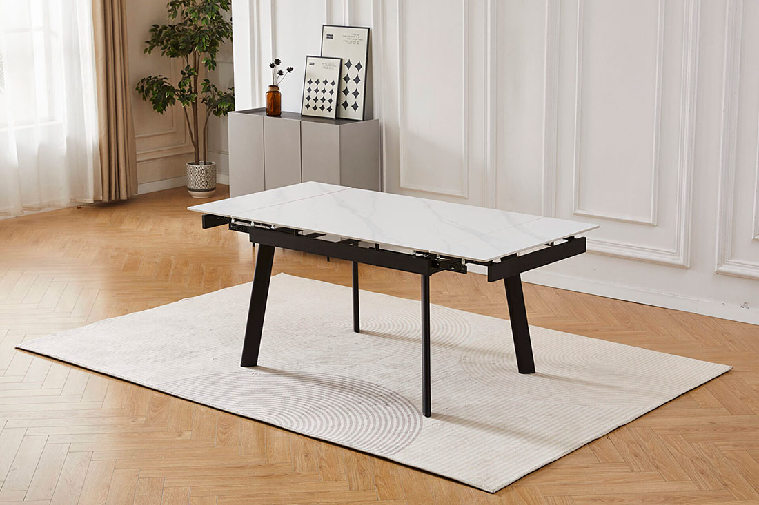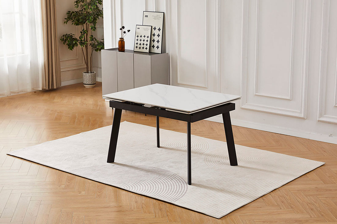 Этот стол сочетает в себе стиль, долговечность и функциональность. Его керамическая столешница, на которую нанесено изображение белого мрамора с легкими серыми прожилками, создает в помещении ощущение свежести. Эта поверхность не только привлекательна, но и чрезвычайно практична – она устойчива к царапинам, высоким температурам и пятнам. Крепкие чёрные металлические ножки обеспечивают надежную опору. Когда вам нужно больше места для гостей, стол легко расширяется при помощи боковых выдвижных частей. Мы предлагаем несколько размеров, чтобы вы могли выбрать лучший вариант для вашей кухни или обеденной зоны – они представлены в меню «Размер» ниже на этой странице.