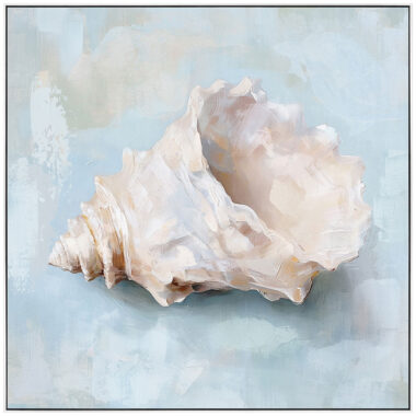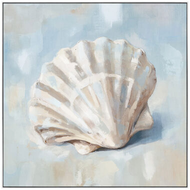 Ця картина у морському стилі зображає велику білу мушлю на м'якому блакитно-кремовому тлі. Візуальна основа створена за допомогою цифрового друку, що дозволило точно передати м'якість світла та тіні. Особливої художньої цінності роботі надає ручне нанесення фарб поверх друку, що відтворює широкі мазки та текстуру олійного живопису. Палітра, витримана у приглушених