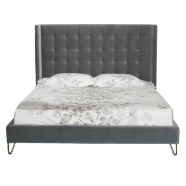 Елегантне сучасне ліжко з високим узголів’ям, прошитим у техніці капітоне і доповненим затишними бічними “вухами”. Корпус ліжка оббитий зручною у використанні велюровою тканиною у спокійних сірих тонах. Тканина вкрита невеликим ворсом, що забезпечує їй прекрасні тактильні властивості й стійкість до забруднень, а при необхідності легко чиститься. Тонкі латунні ніжки додають