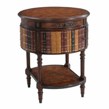 Кругла стільниця покрита коричневою натуральною шкірою, у фриз вбудована невелика шухляда. Під ними знаходиться відділення з дверцятами, зовнішня частина якого має вигляд корінців книг із золотим тисненням. Різьблені ніжки з'єднані додатковою поличкою і закінчуються латунними наконечниками. Репродукція оригіналу в стилі Людовика XVI.